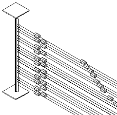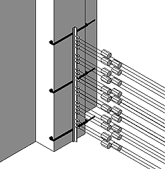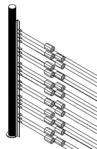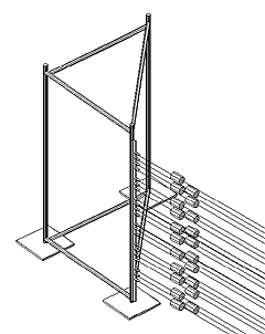 | バレーボールコートの支柱: バレーボールコートの支柱があれば、最も容易にストリングラフィ設置する ことが可能です。 アルミバー:(長さ約2m) 支柱には、こちらで用意しているアルミバーをバインド線(針金)でくくりつ け、6cmごとにあけられているアルミバーの穴にSかん(S型のフック)をひっ かけ、糸(楽器)を取り付けていきます。 |